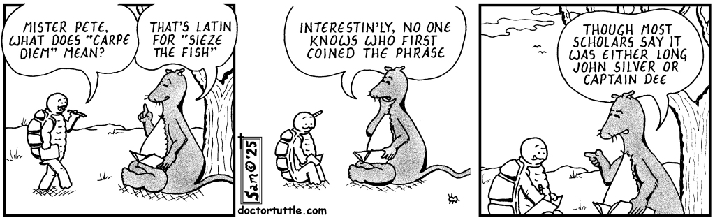 Posted on January 6, 2026October 24, 2025Author samwhi371Categories Food, Pete, Puns, TottleTags #CaptainDees, #CarpeDiem, #comic, #DoctorTuttle, #fish, #food, #humor, #Latin, #LJS, #PetePossum, #Tottle