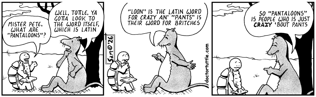 Posted on February 8, 2026January 29, 2026Author samwhi371Categories Pete, Puns, TottleTags #comic, #DoctorTuttle, #humor, #pantaloons, #PetePossum, #Tottle